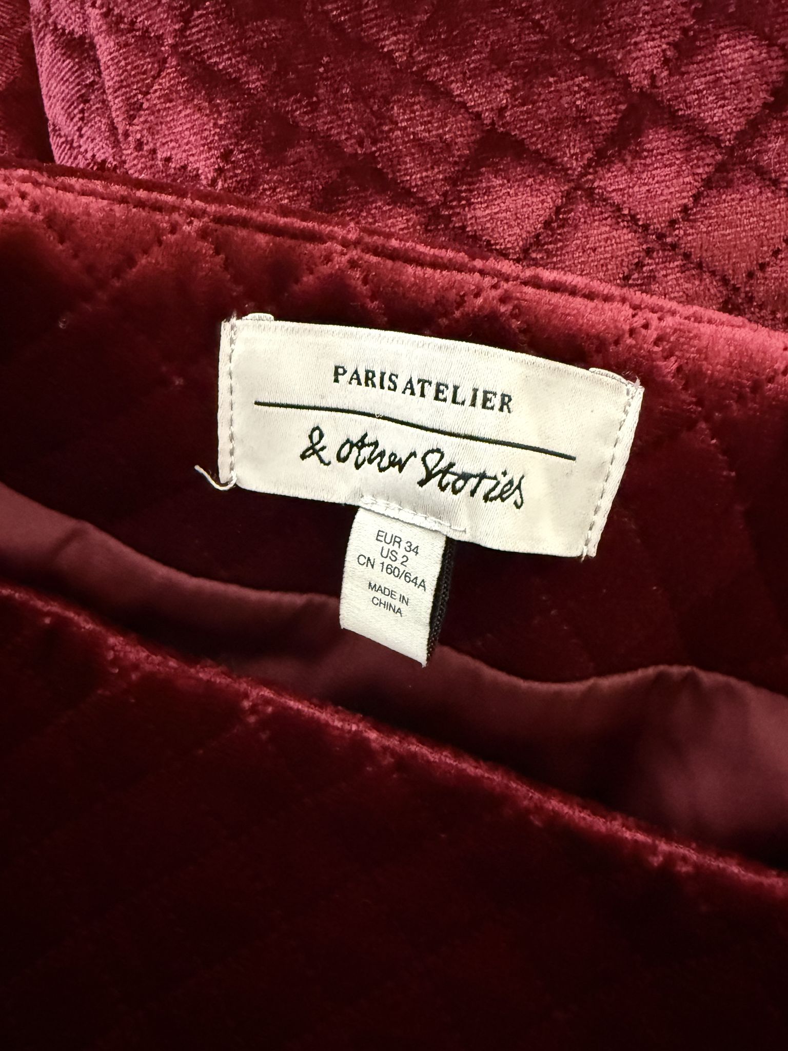 Dieser Secondhand Rock von & Other Stories liefert dir bordeauxfarbenen Samtglam, der aussieht, als hättest du ihn frisch aus einer kultigen Holiday-Romcom geliehen. Die eng anliegende Passform macht ihn super sleek, während die gesteppt wirkende Struktur dem Look ein bisschen Retro-Drama verleiht. Ein Piece für alle Xmas- und Party-Nächte, in denen du ganz klar die Hauptrolle spielst.