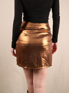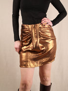 Dieser Secondhand-Minirock in schimmerndem Kupfer-Bronze ist ein echtes Statement-Piece! Mit seinem glänzenden Finish und der raffinierten Drapierung zieht er alle Blicke auf sich – perfekt für eine Night-Out oder ein stylisches Streetstyle-Upgrade. Der fließende Polyesterstoff sorgt für eine schmeichelnde Passform, während der Metallic-Look deine Outfits auf das nächste Level hebt. Preloved, aber ready für neue Abenteuer!