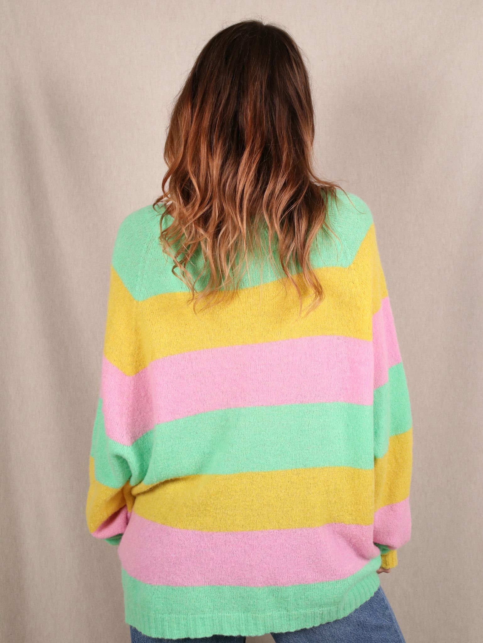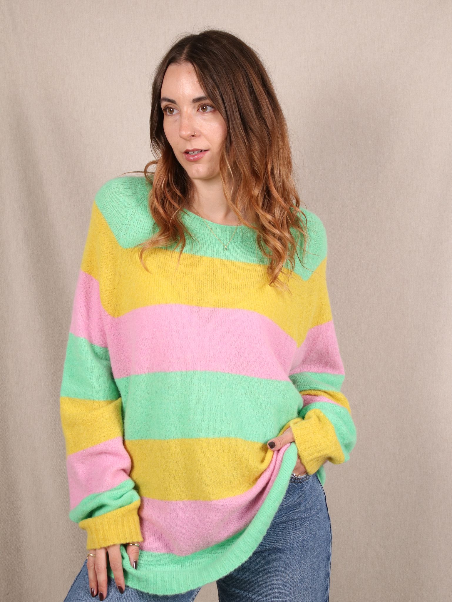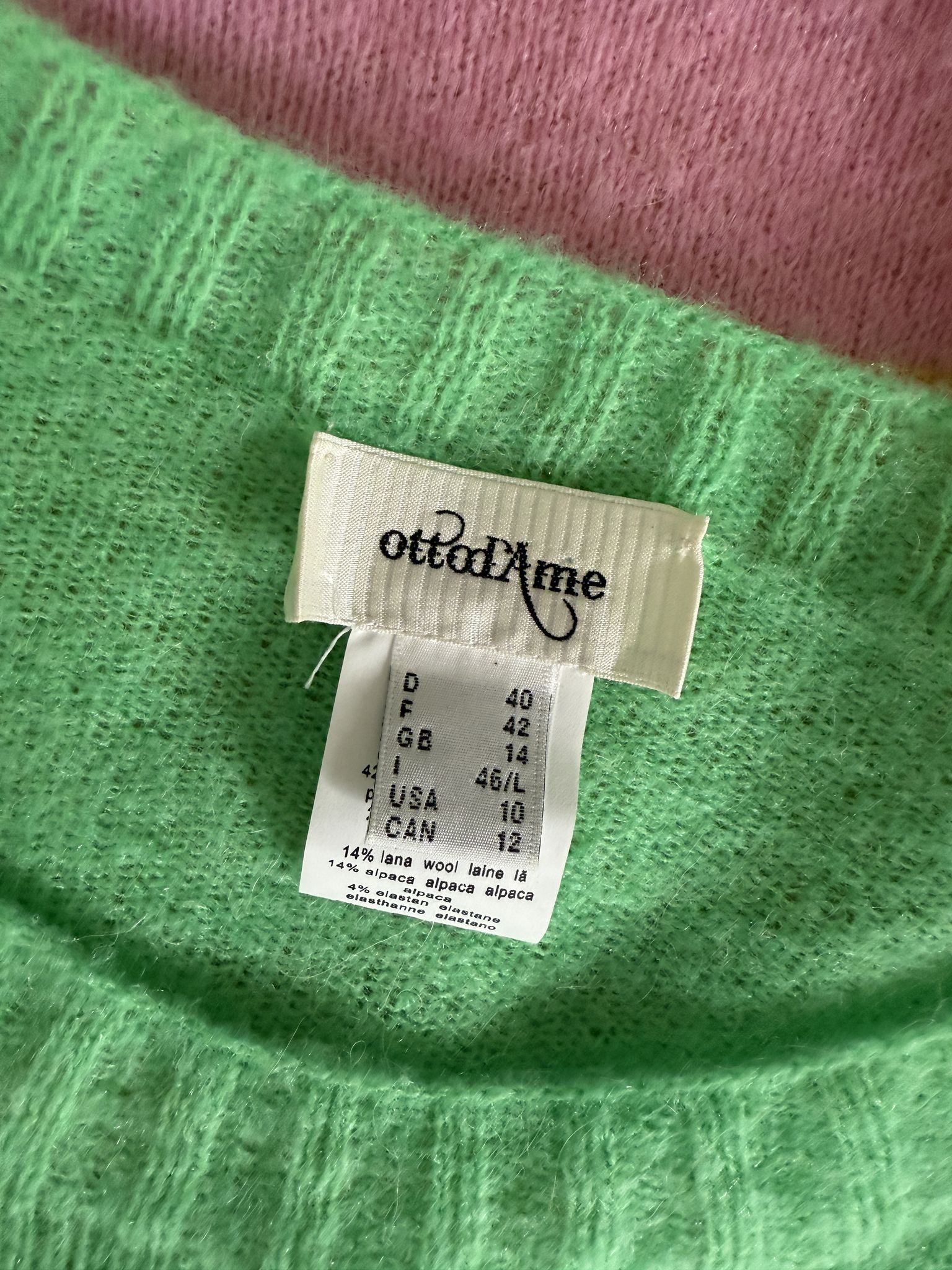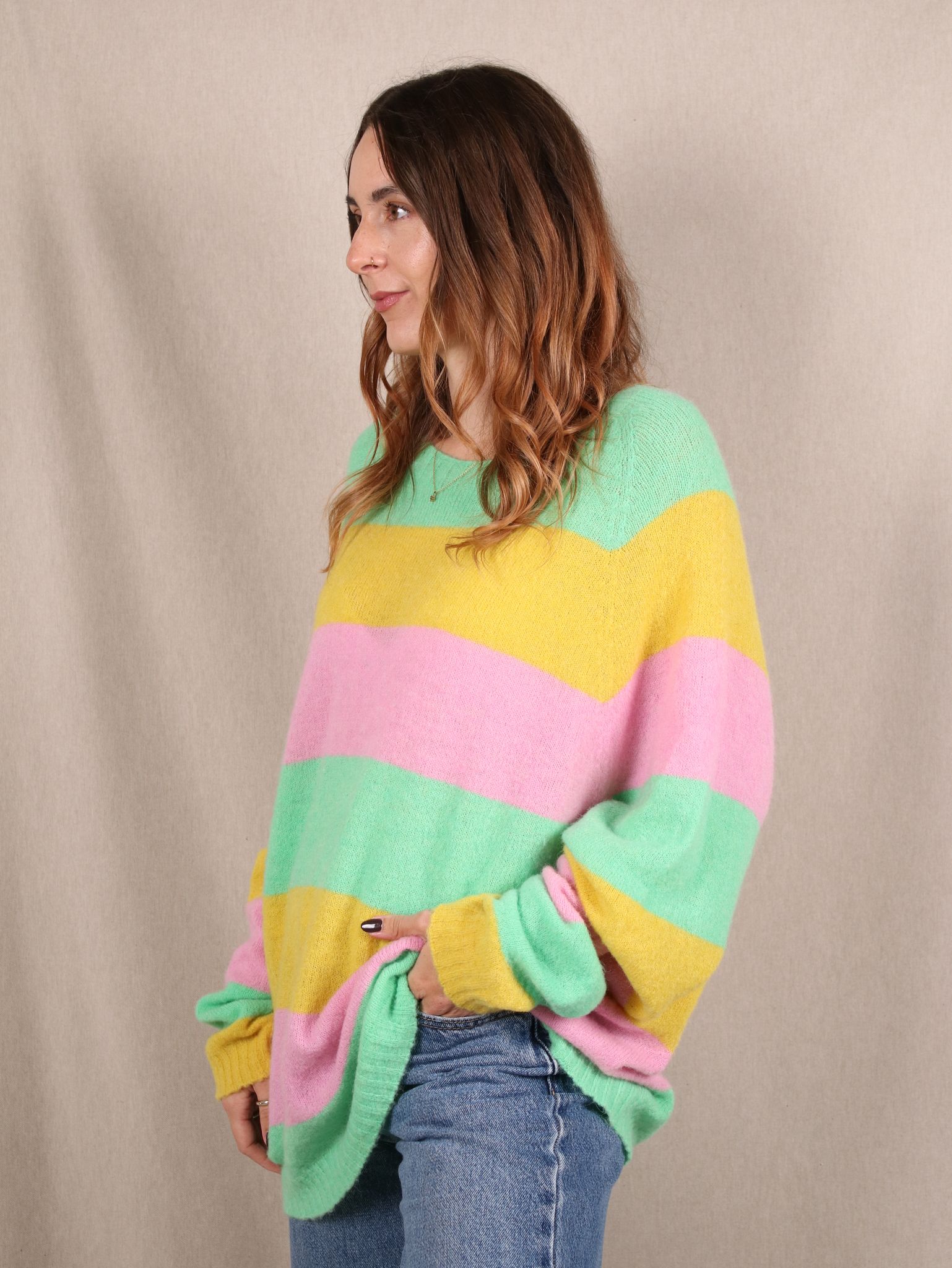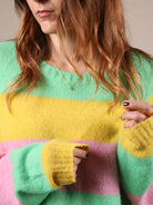 Dieser oversized Strickpullover von ottod'Ame bringt Farbe in jeden grauen Tag – oder in deinen Insta-Feed. Mit seinen bolden Streifen in Mint, Pink und Sonnengelb ist er ein echtes Statement-Piece, das nach Disco-Playlist und Freestyle-Tanzen ruft. Kuschelig, cozy und natürlich Secondhand.