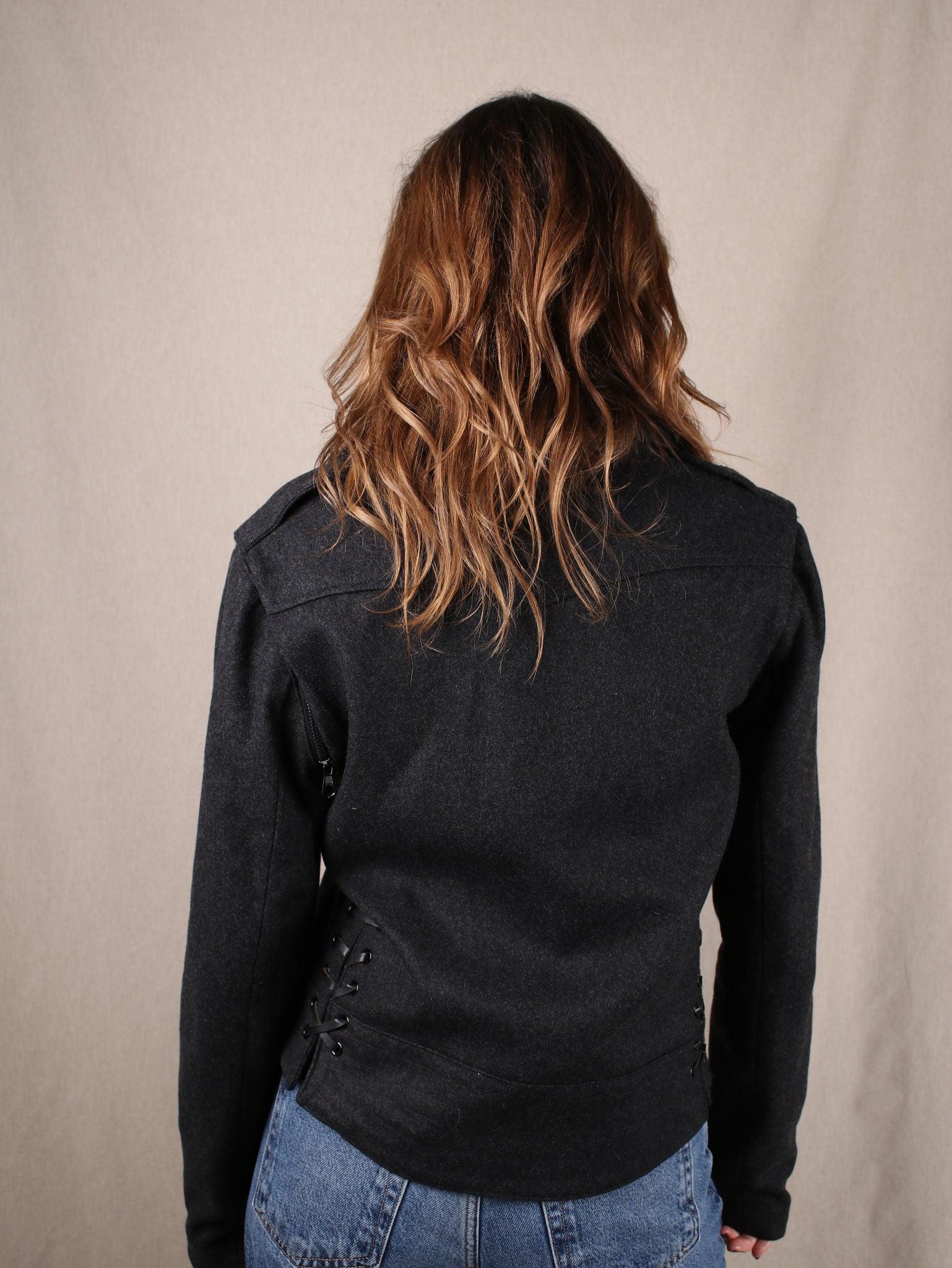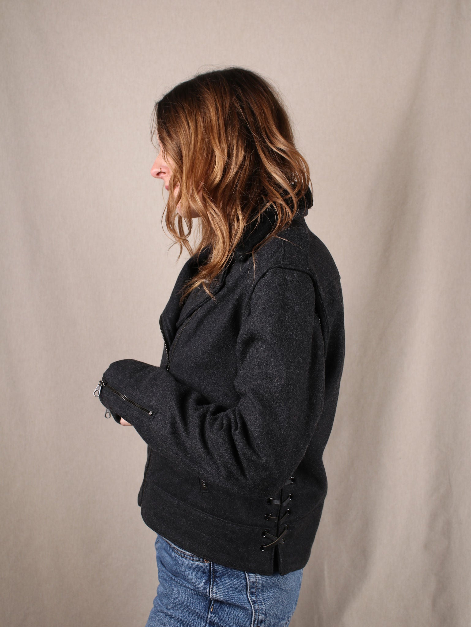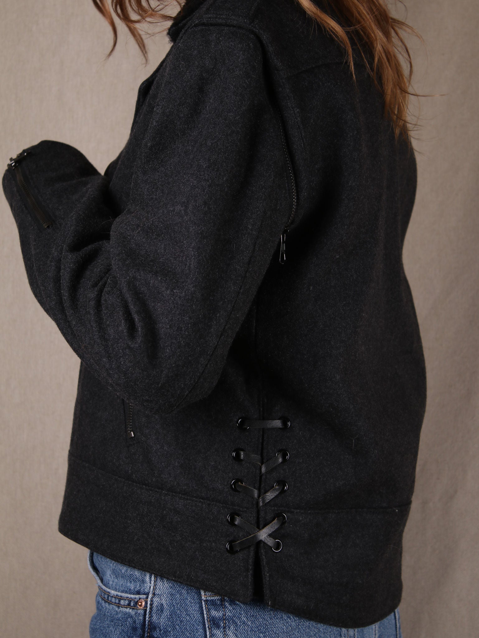 Jacke aus Woll-Mischung mit abnehmbaren Ärmeln, Schnürung aus Lammleder an den Seiten und Kunstfellkragen