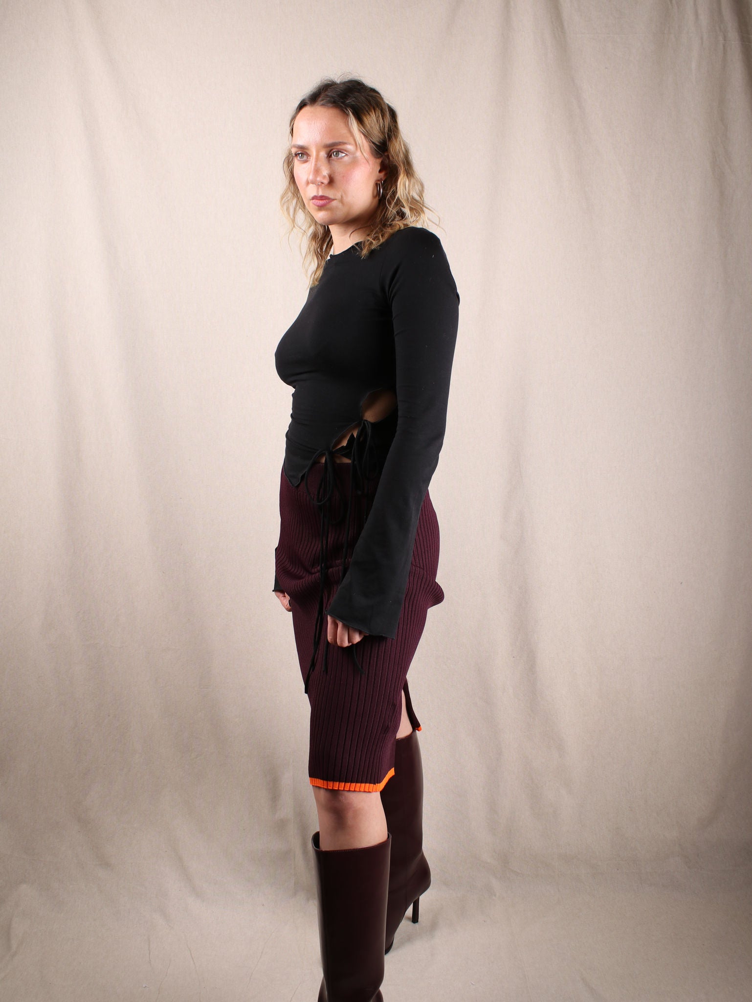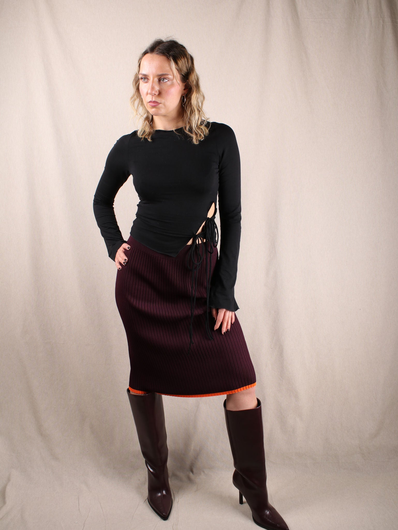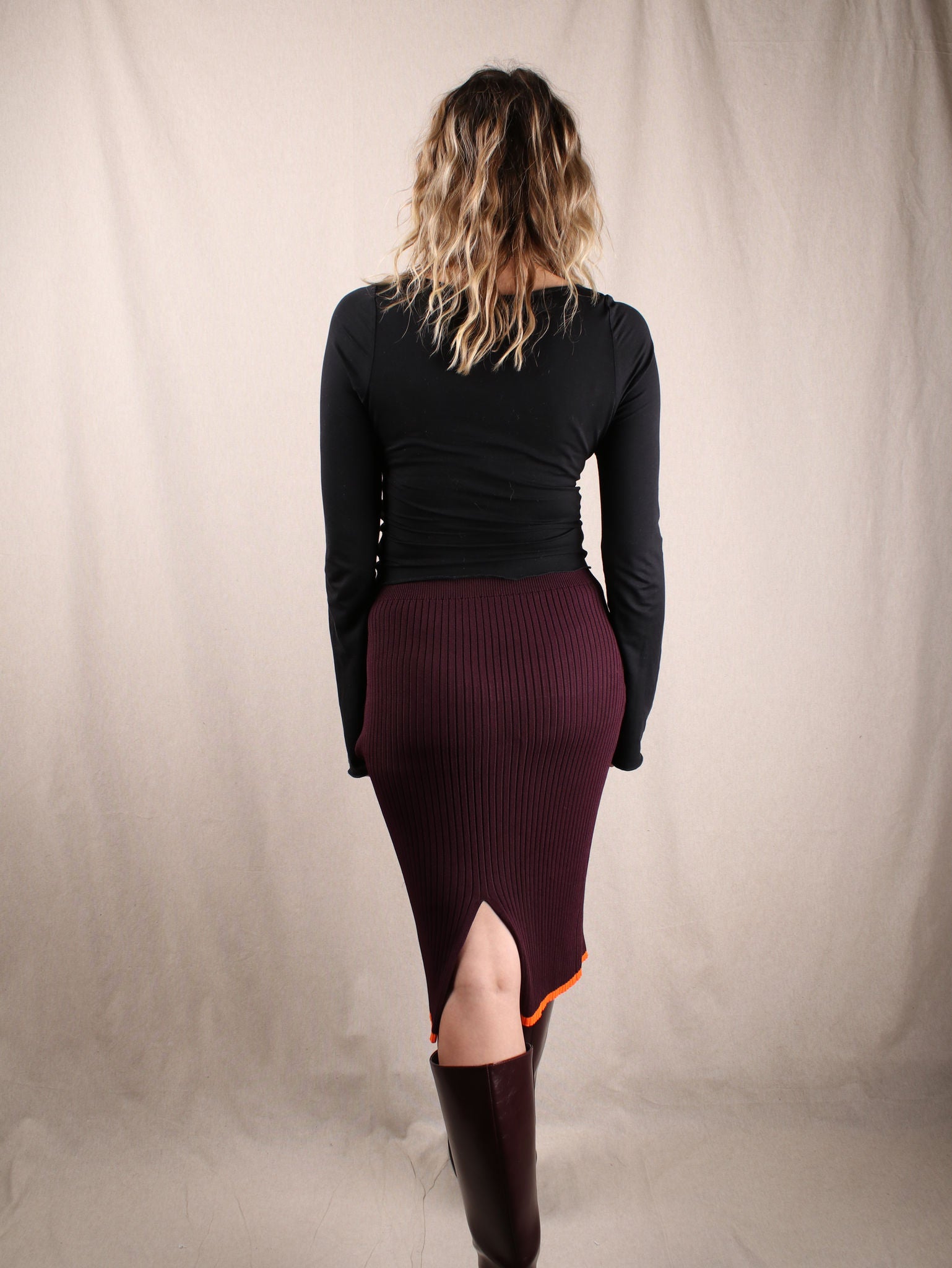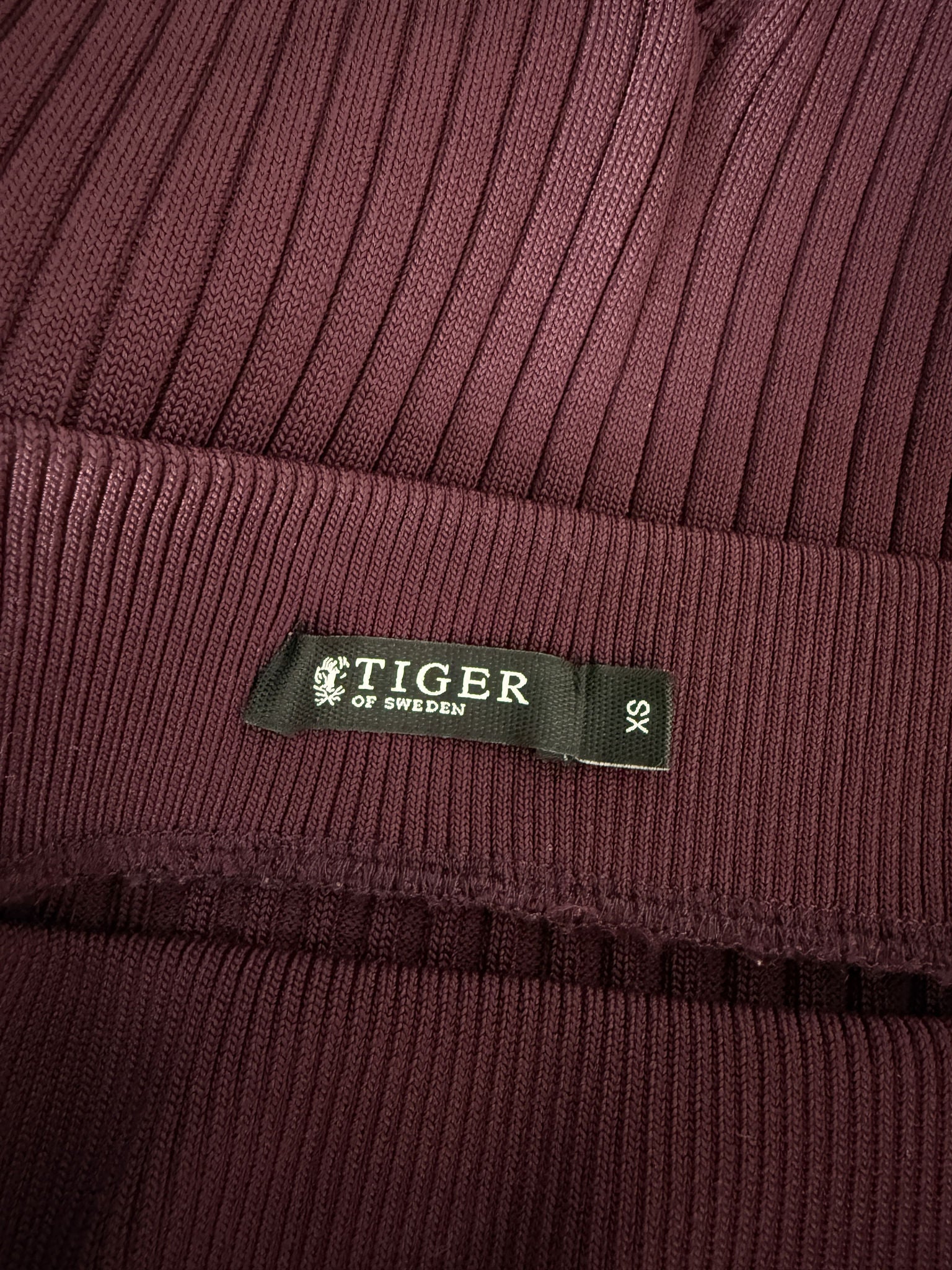 Bordeaux to the Core Entdecke dieses Preloved-Schätzchen von Tiger of Sweden, das mit seiner bordeauxfarbenen Eleganz und dem enganliegenden Ripp-Gewebe alles andere als gewöhnlich ist. Die High-Waist-Midi-Länge setzt deine Kurven perfekt in Szene und verleiht dir einen Hauch von Vintage-Chic. Style es mit einem einfachen Crop-Top und deinen Lieblingssneakern für einen Look, der mühelos cool ist oder mit hohen Stiefeln.