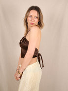 Mit seinem verführerischen Halterneck-Schnitt und dem luxuriösen Satin-Finish versprüht dieses Motel-Top pure 90s-Energie. Die gerafften Cups sorgen für eine schmeichelnde Passform, während das tiefe Braun einen edlen, warmen Ton setzt. Perfekt für sommerliche Nächte, Rooftop-Partys oder als elegantes Layering-Piece unter einem Blazer. Ein echtes Statement für alle, die Retro-Glam mit modernem Twist lieben!