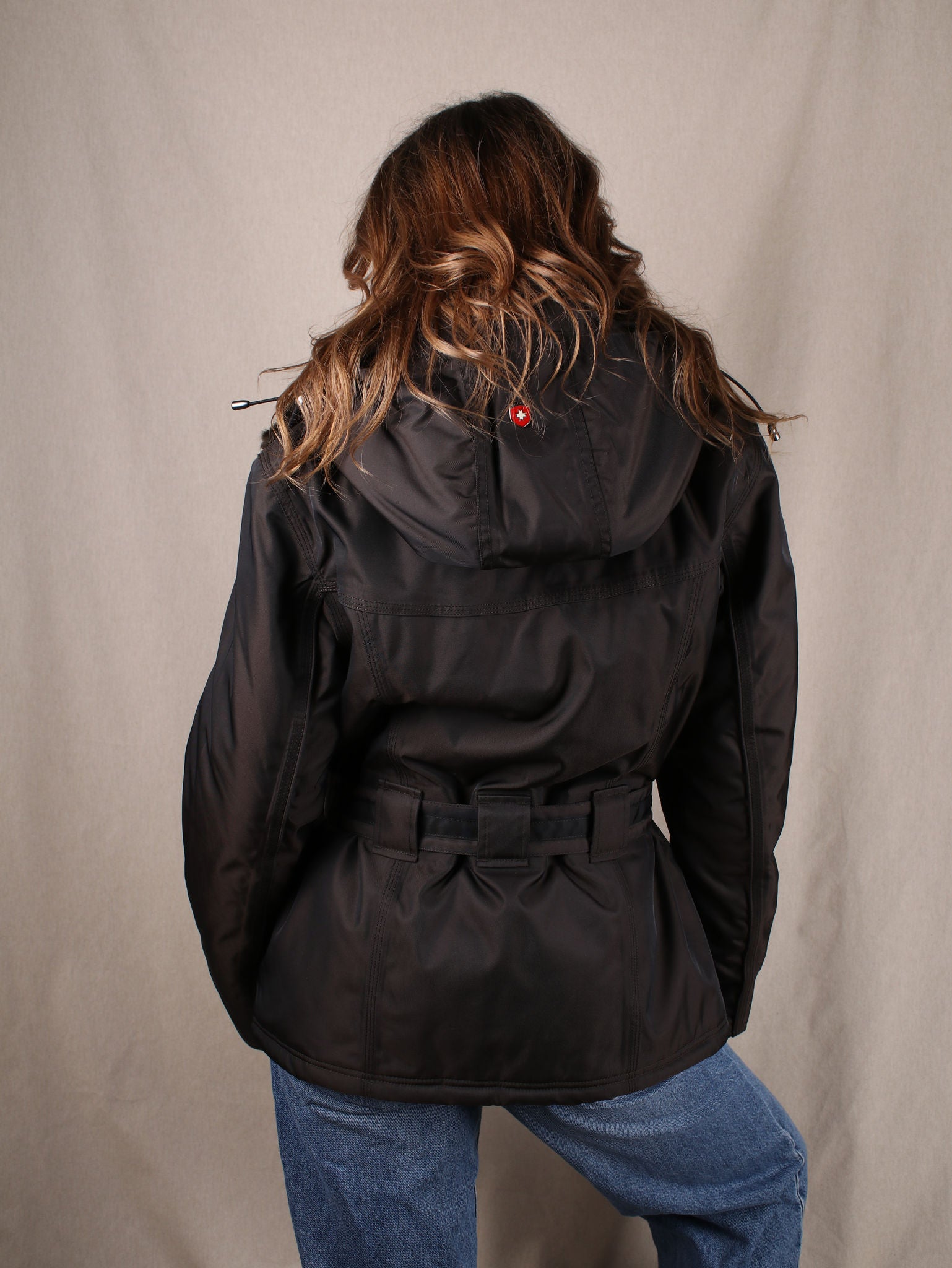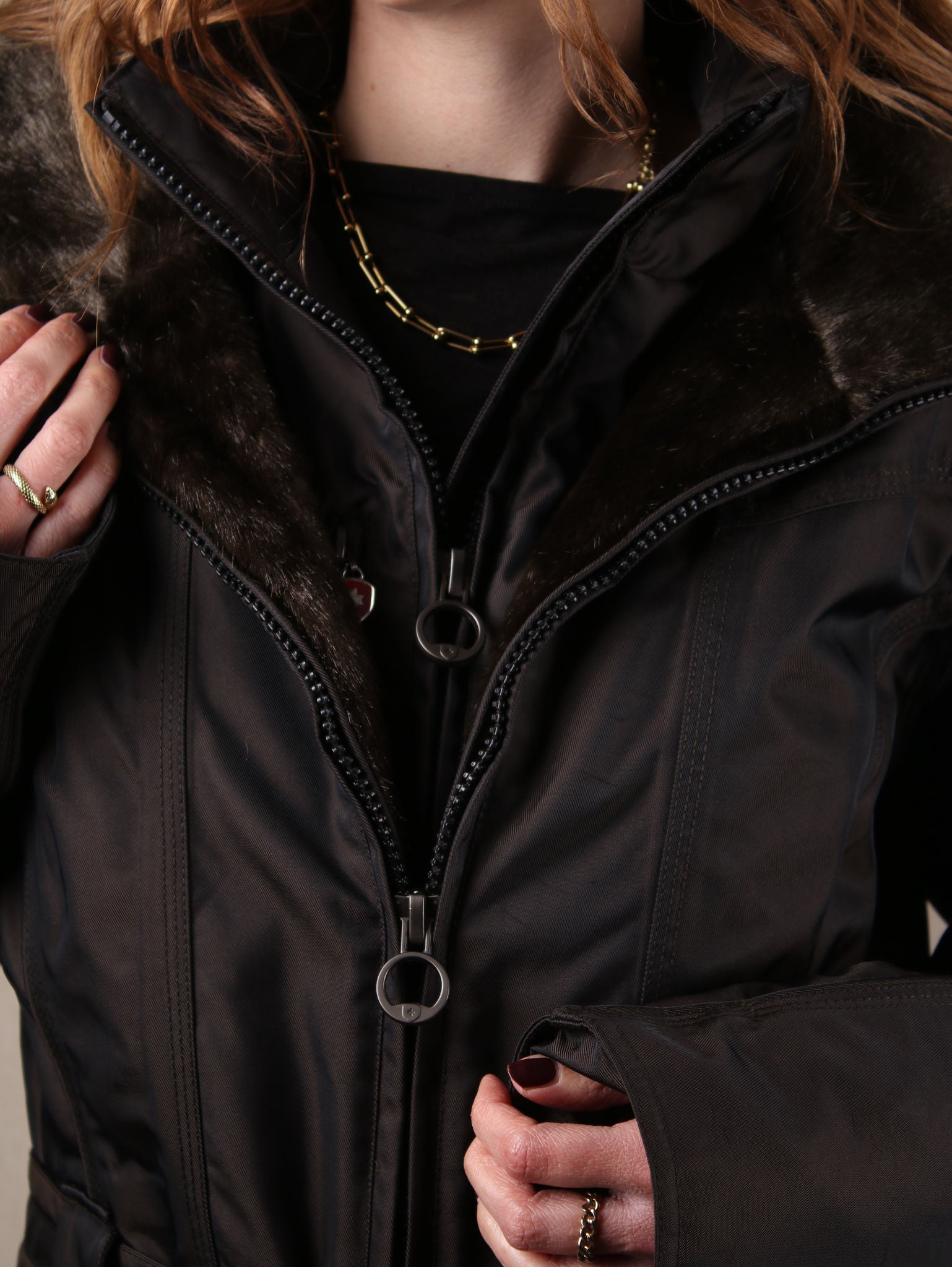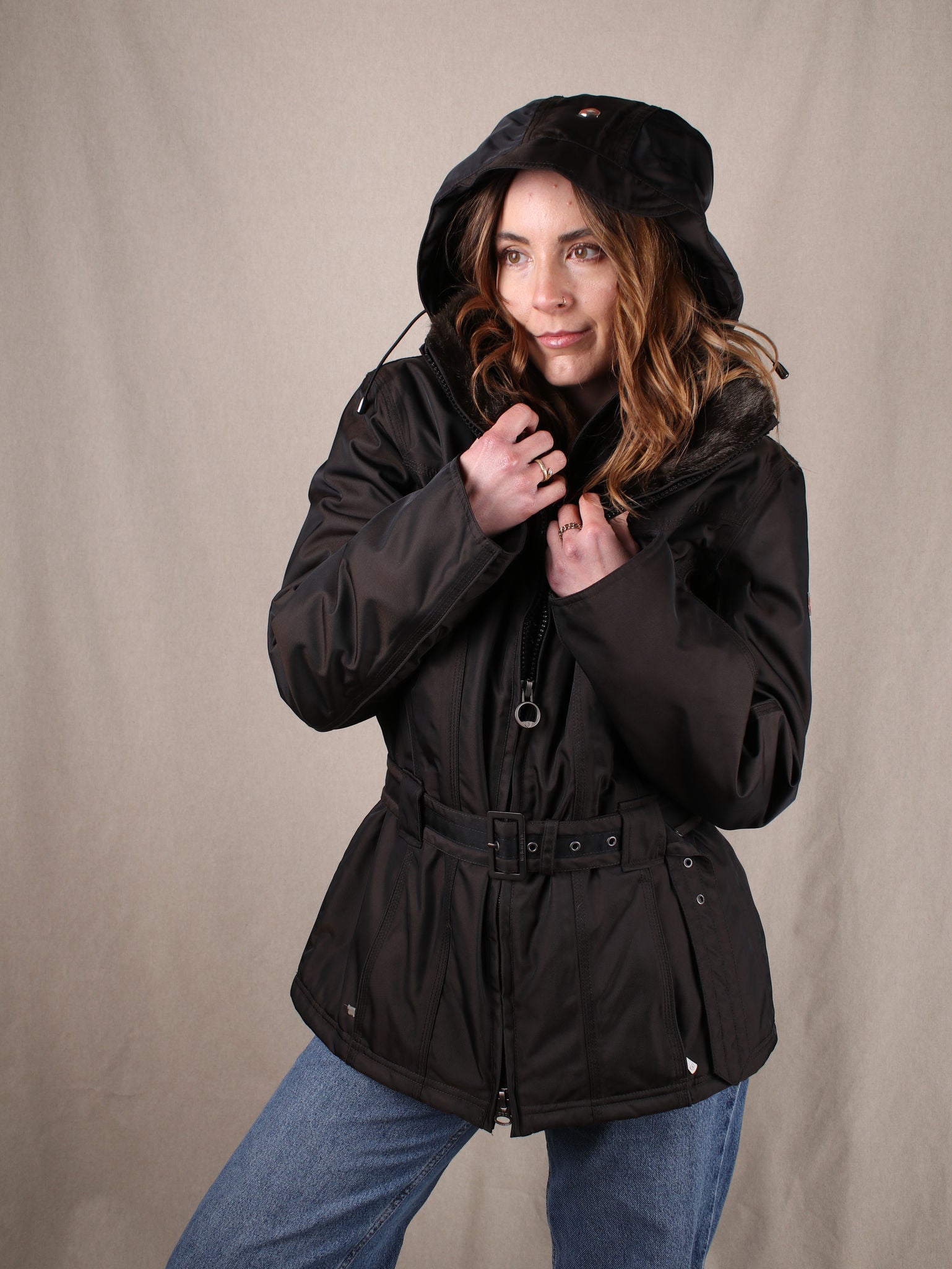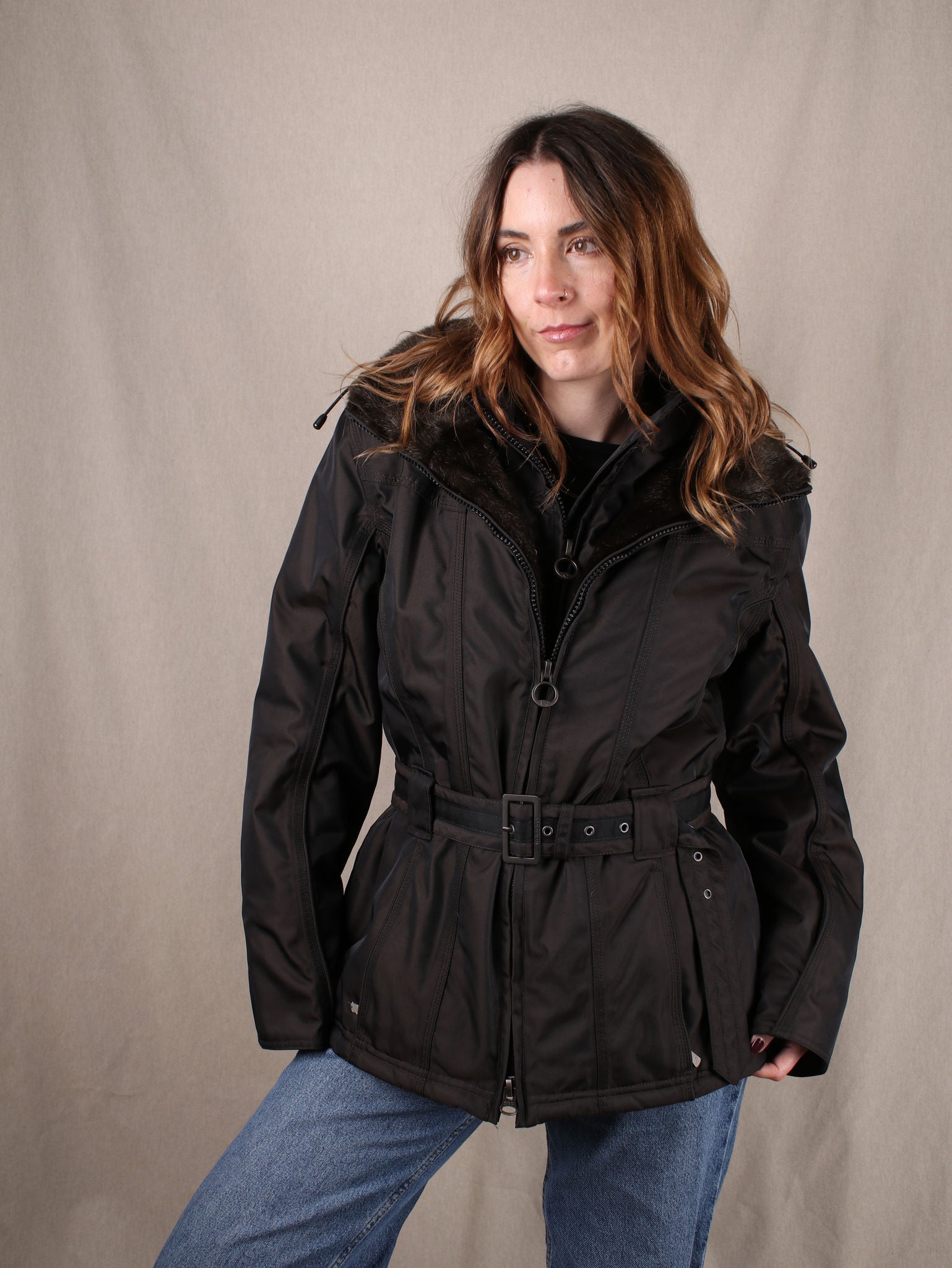 Gefütterte Jacke mit Kunstfellkragen, doppeltem Reißverschluss und Taillengürtel