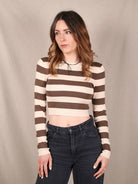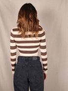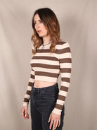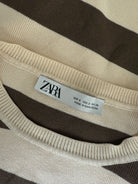 Dieser Secondhand Zara Pullover bringt 70s-Vibes direkt in deinen Kleiderschrank. Der gestreifte Cropped-Schnitt in Mocha-Mousse-Tönen sitzt dank feinem Viskose-Strick super comfy und sieht dabei mega stylish aus. Retro war noch nie so modern!