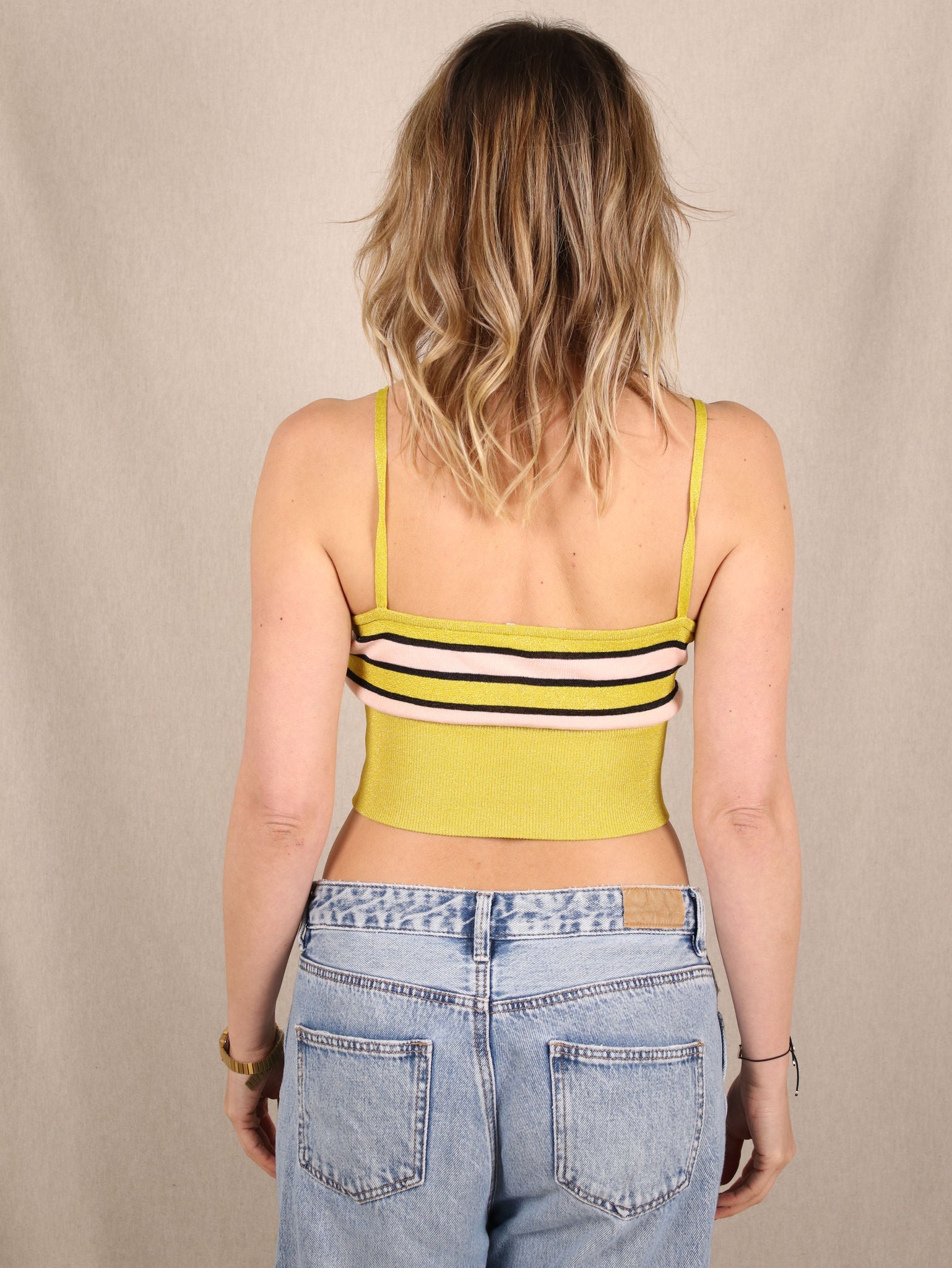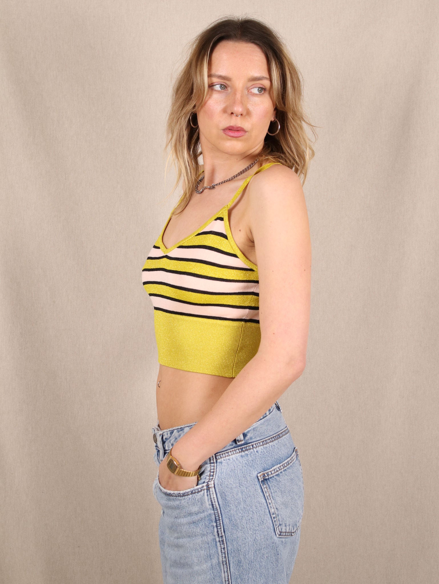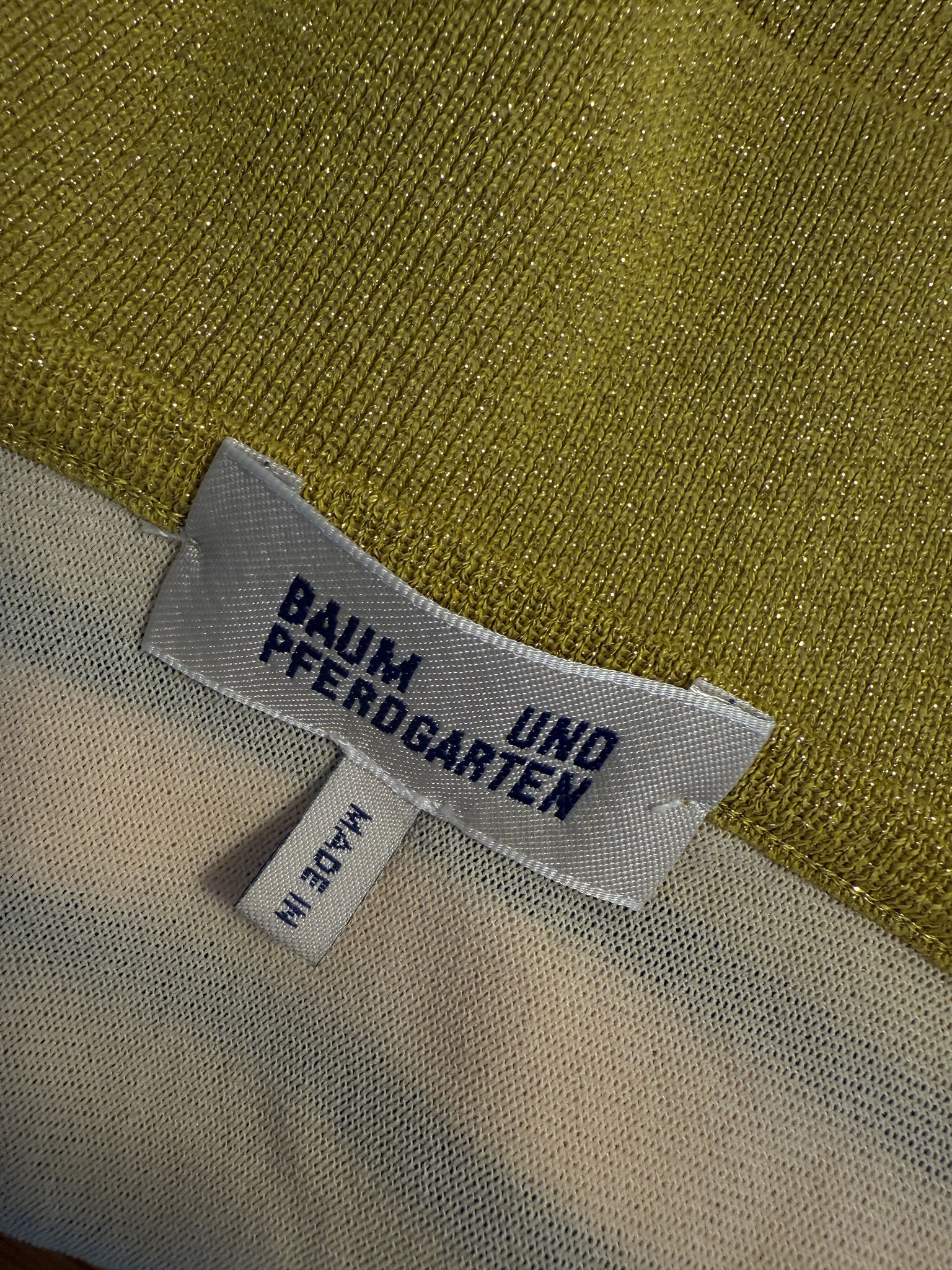 Dieses preloved Baum und Pferdgarten Stricktop bringt mit seinem gelben Glitzer-Look das perfekte Funkeln in deine Outfits! Die Mischung aus Tencel und metallischem Polyesterfilm sorgt für ein angenehmes Tragegefühl mit leichtem Stretch. Ob mit Jeans für einen lässigen Streetstyle oder als Hingucker unter einer Lederjacke - ein echtes Must-have für deinen Kleiderschrank!