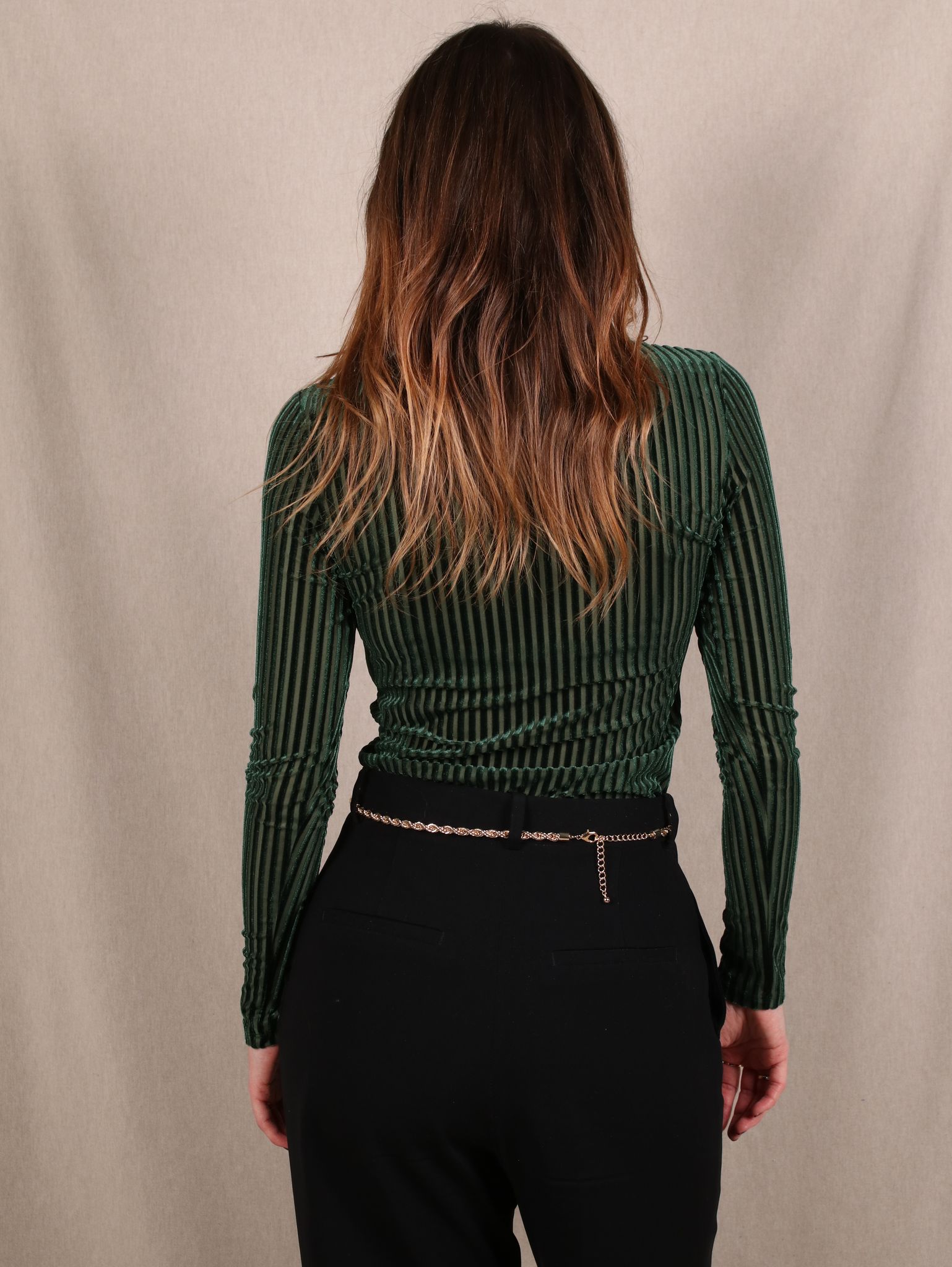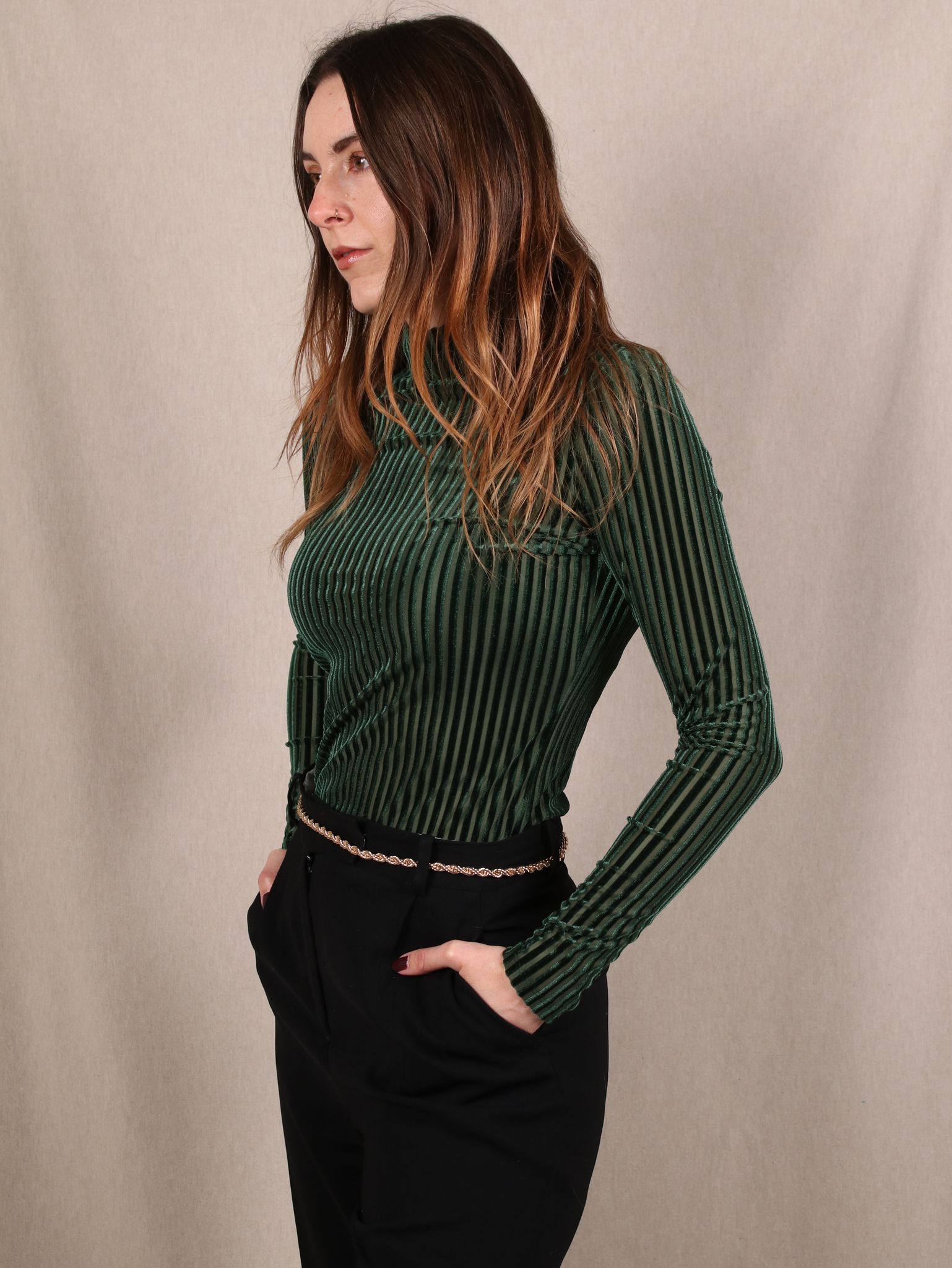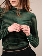Dieses Secondhand T Shirt von Monki bringt dir Party Vibes mit Understatement. Das dunkelgrüne Samtmaterial und die schmalen Streifen sorgen für einen Look, der elegant glänzt, ohne laut zu werden, während die eng anliegende Passform deinen Style schön auf den Punkt bringt. Perfekt für Xmas Nights, bei denen du lieber smooth shimmerst als wild blinkst.
