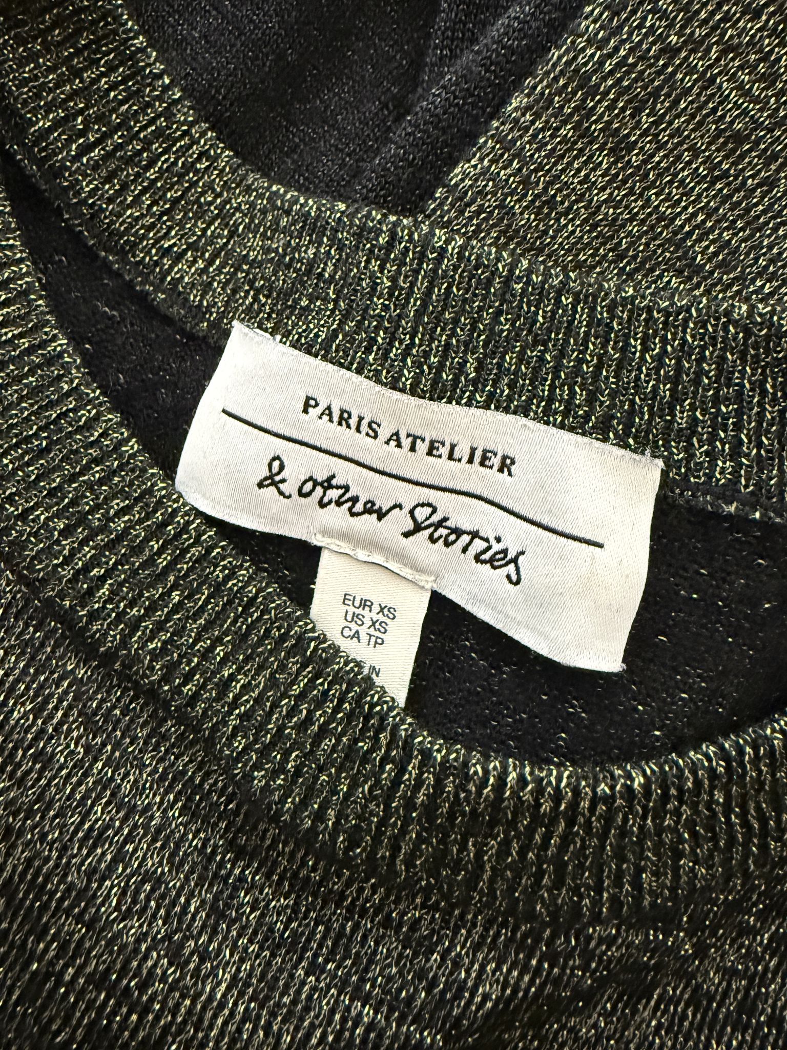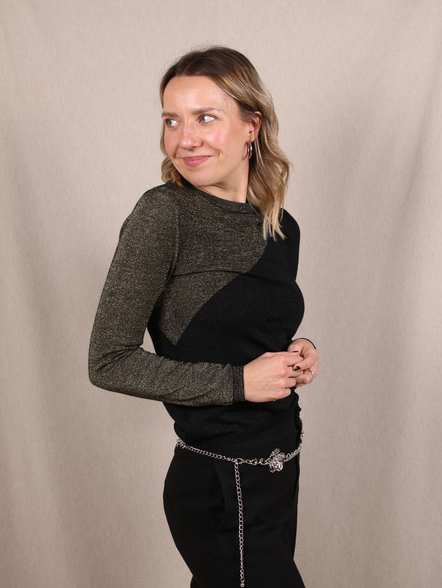 Dieser Secondhand Pullover von & Other Stories kommt mit einer gold-schwarzen Zweifarb-Optik, die aussieht, als wärst du direkt auf einem stylischen Filmplakat gelandet. Der eng anliegende, glitzernde Strick schmiegt sich an, während der diagonale Farbverlauf deinem Look sofort einen edgy Party- und Xmas-Vibe verpasst. Ein Piece für alle, die gern so wirken, als hätten sie ihre eigene Cinematic Universe Origin Story.