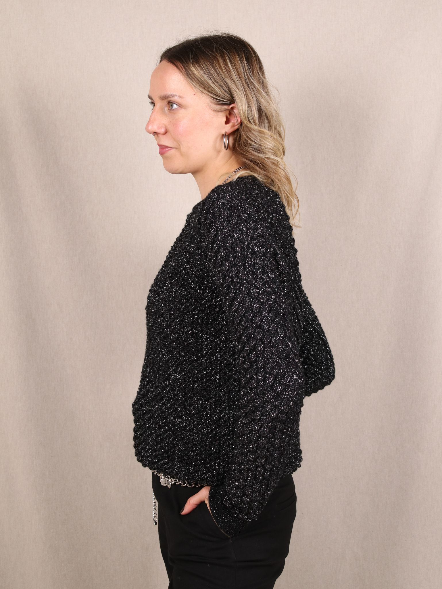 Dieser Secondhand Pullover von & Other Stories bringt dir glitzernde Winter-Vibes, als hätte jemand das Funkeln einer Xmas-Lichterkette direkt in den Strick gewebt. Die normale Passform macht ihn super cosy, während das silberne Schimmer-Statement jedes deiner Outfits sofort upgraden kann. Ein Piece für Tage, an denen du leuchten willst, ohne dich anzustrengen.