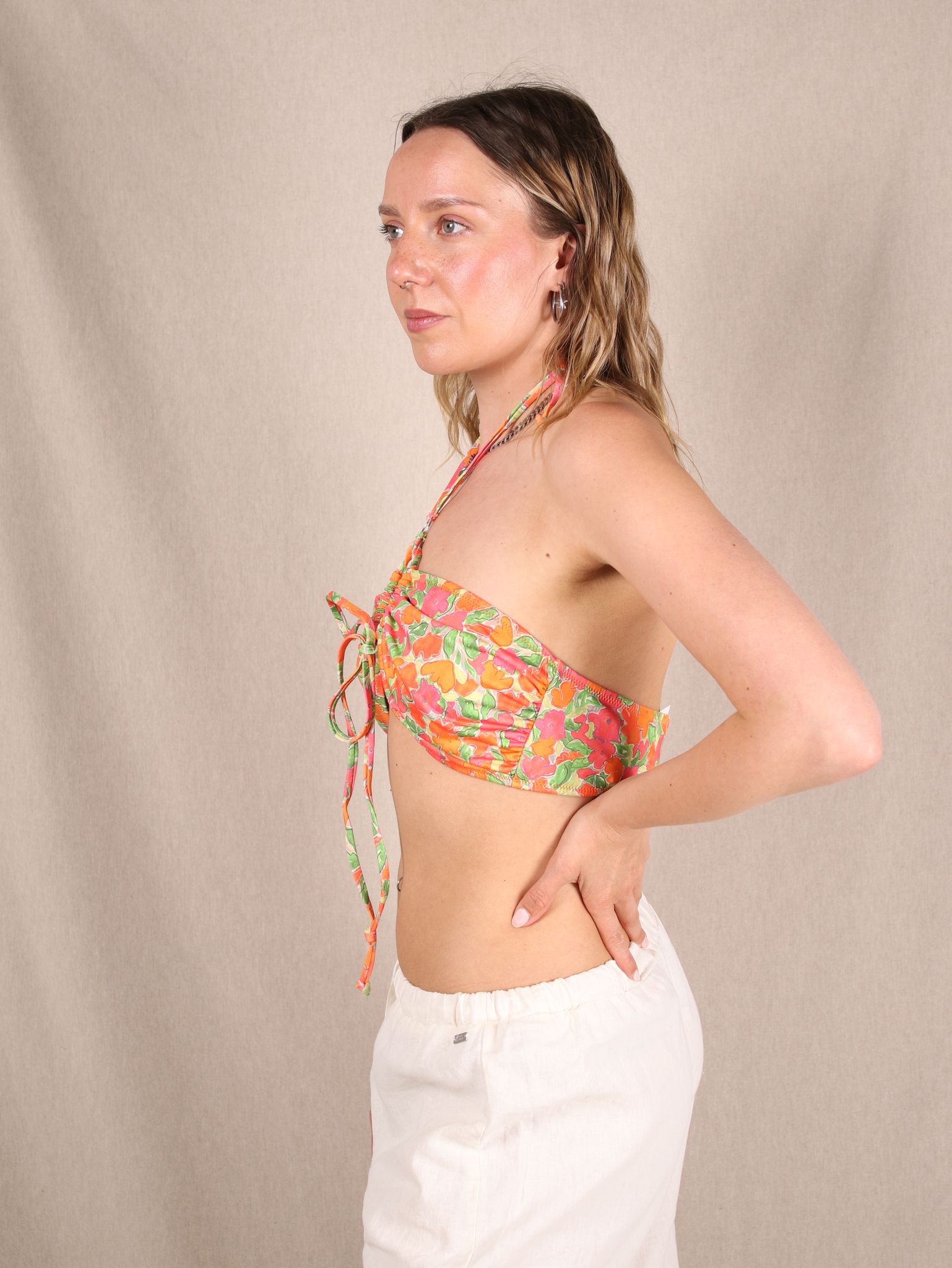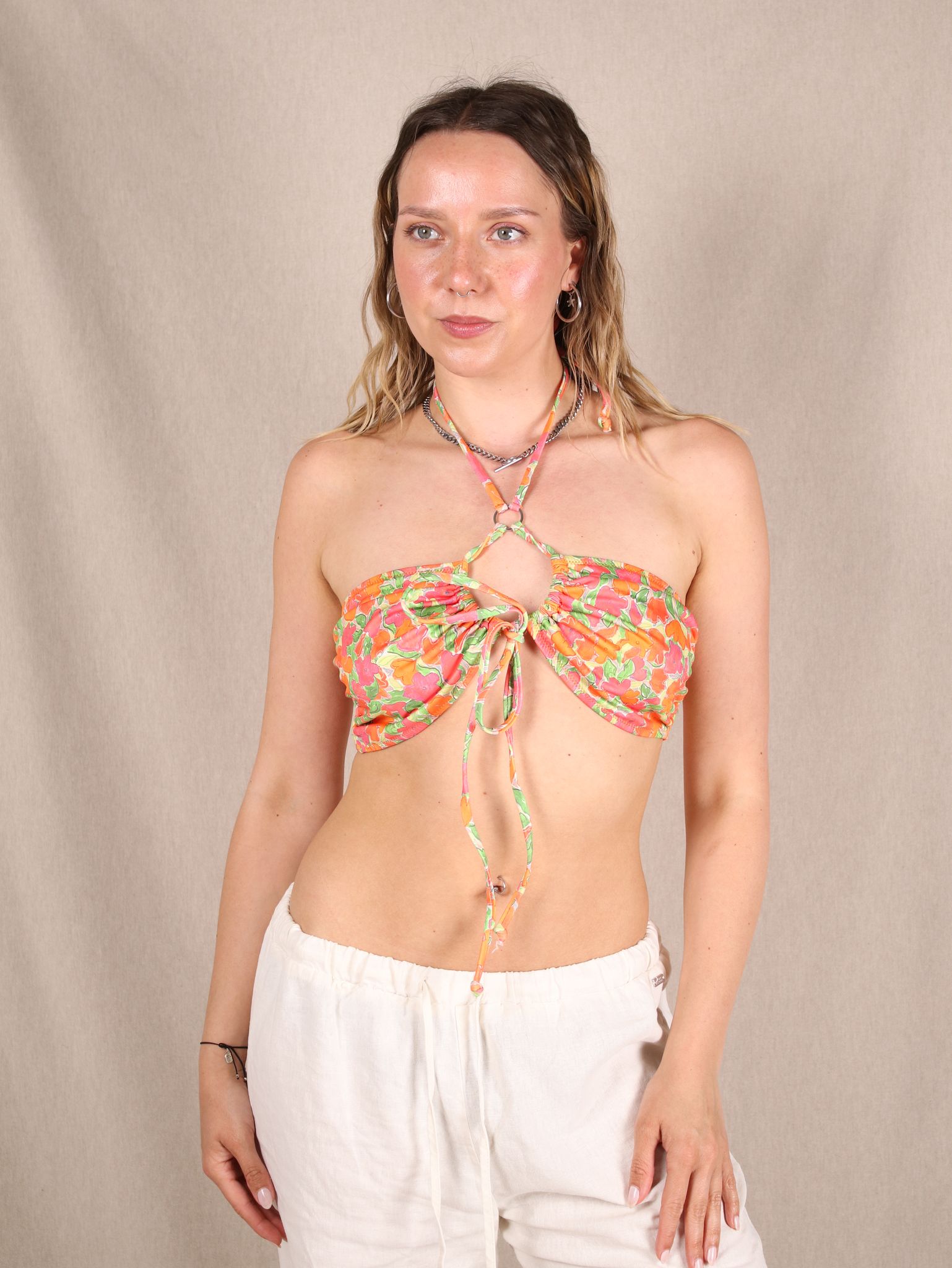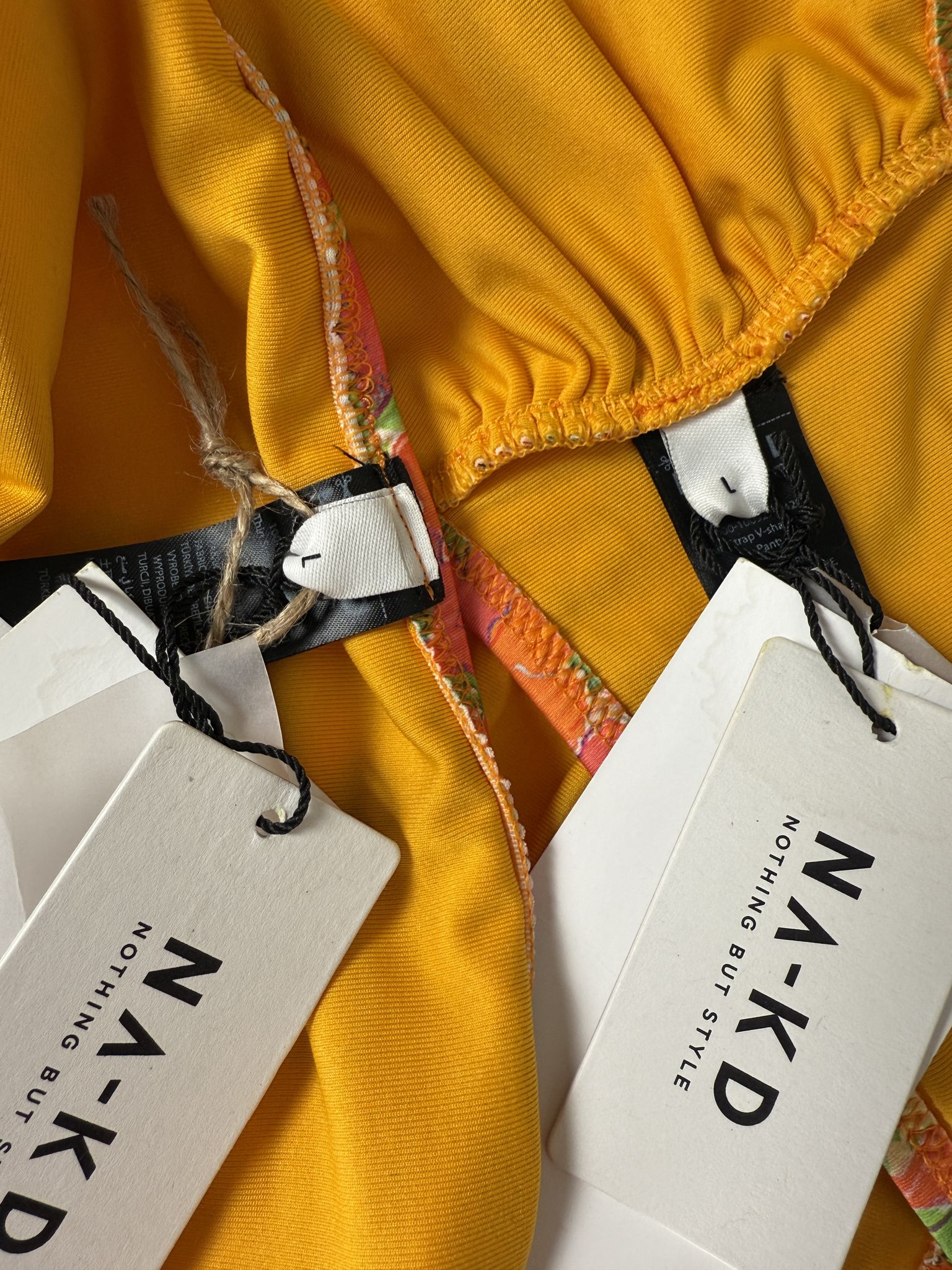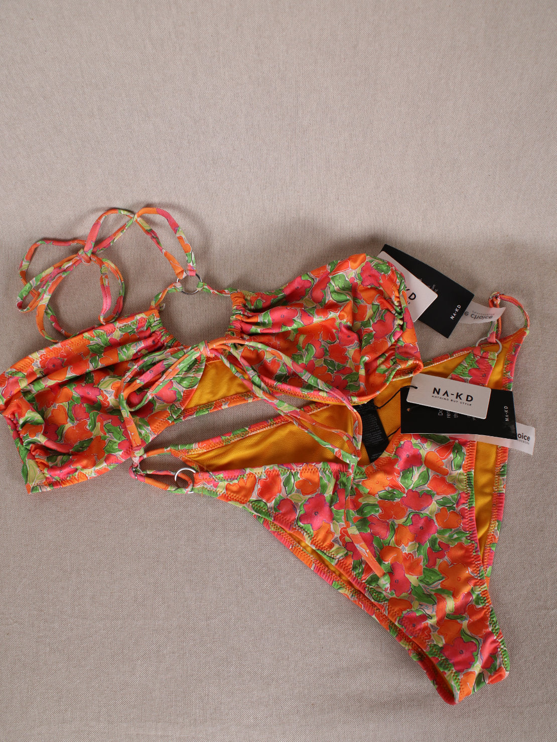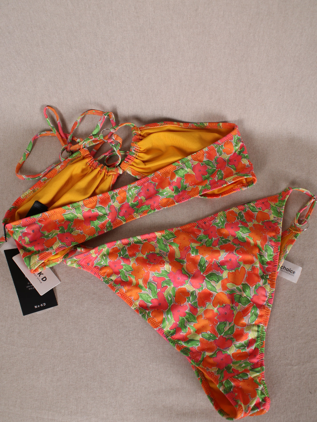 Dieser Bikini von NA-KD macht sofort gute Laune – als wär’s ein Smoothie in Swimwear-Form. Der verspielte Blumenprint in Pink, Orange und Grün trifft auf einen sexy Cut mit Front- und Neckholder-Bindung sowie dekorativen Ringen. Ein Piece, das auffällt, ohne zu übertreiben. Ob Poolparty oder Strandspaziergang – damit bringst du den Sommer überall hin mit.