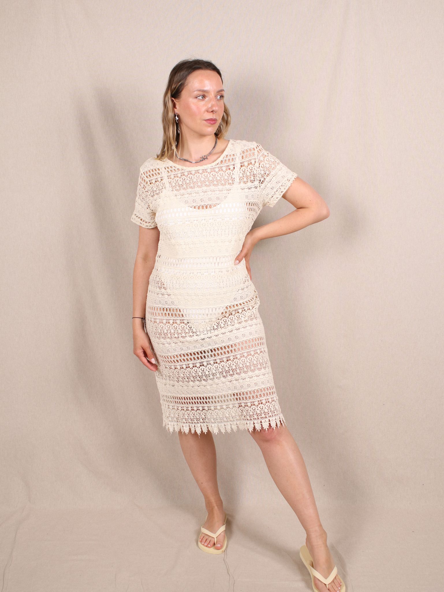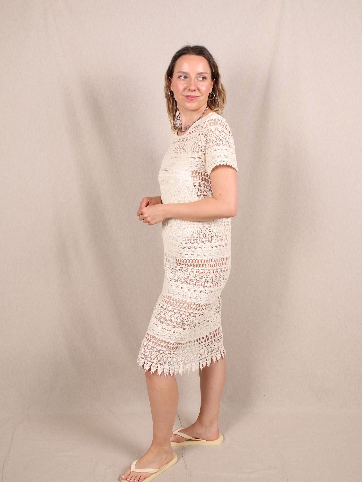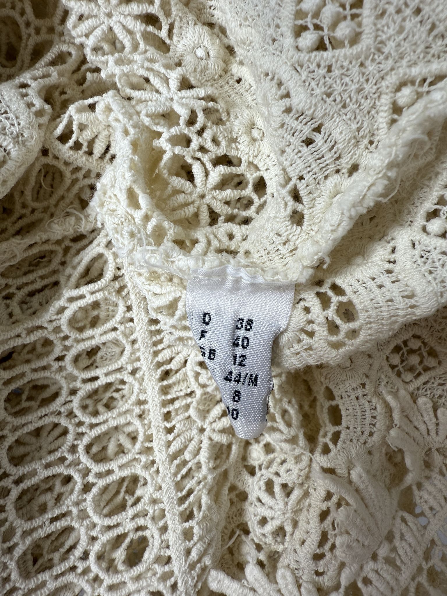 Dieses gehäkelte Kleid in zartem Creme ist die Definition von Beach-Romantik. Luftig, verspielt, und mit genug Häkel-Details, um jedes Festival neidisch zu machen. Der lockere Fit sorgt für maximalen Komfort – ob überm Bikini am Strand oder gestylt mit Sandalen in der City. Und weil es secondhand ist, rettest du damit nicht nur Looks, sondern auch Ressourcen.