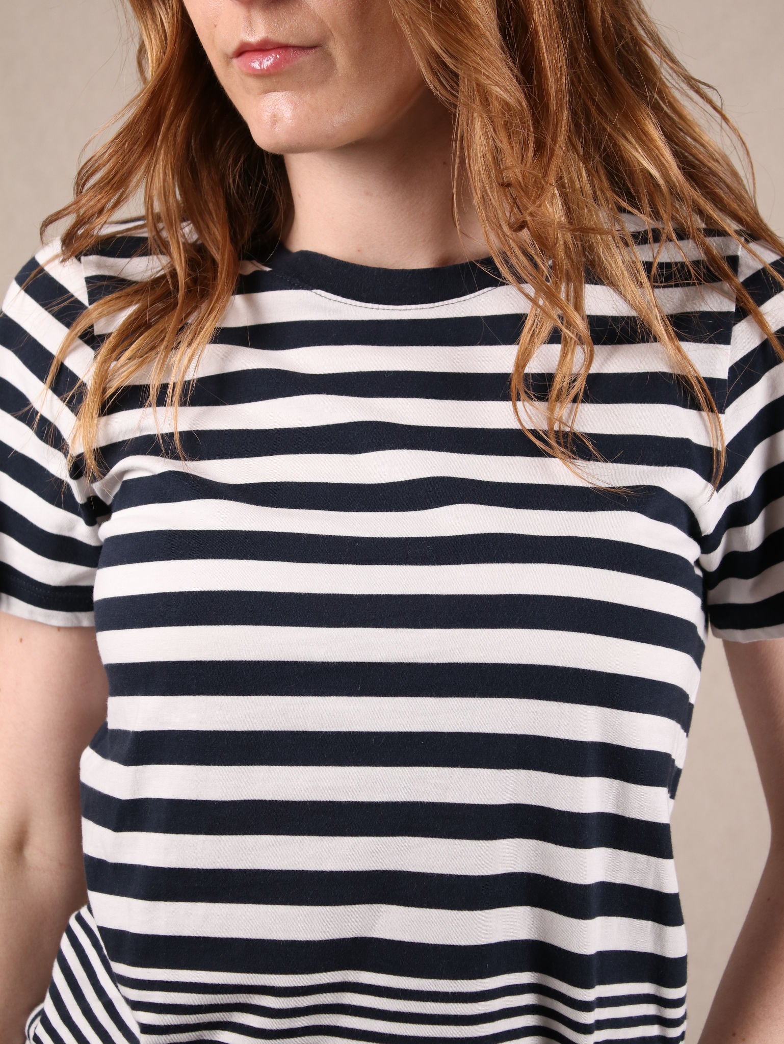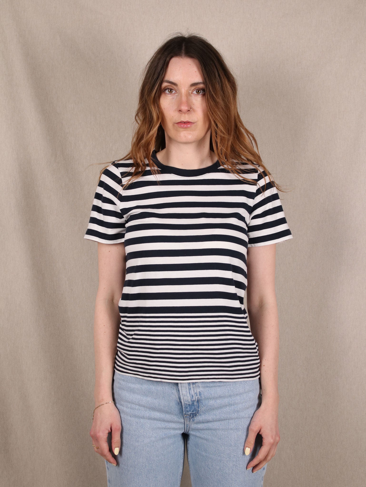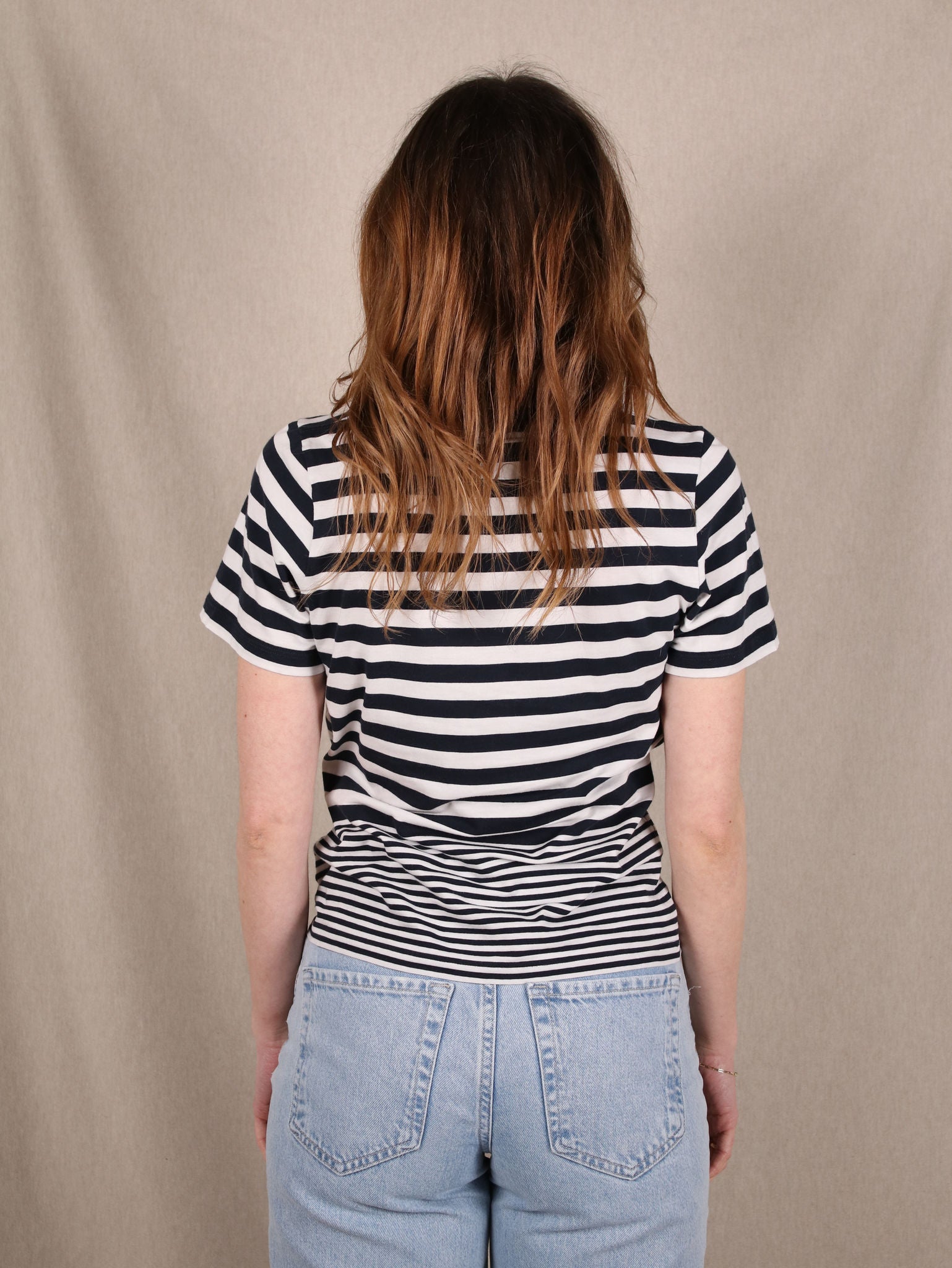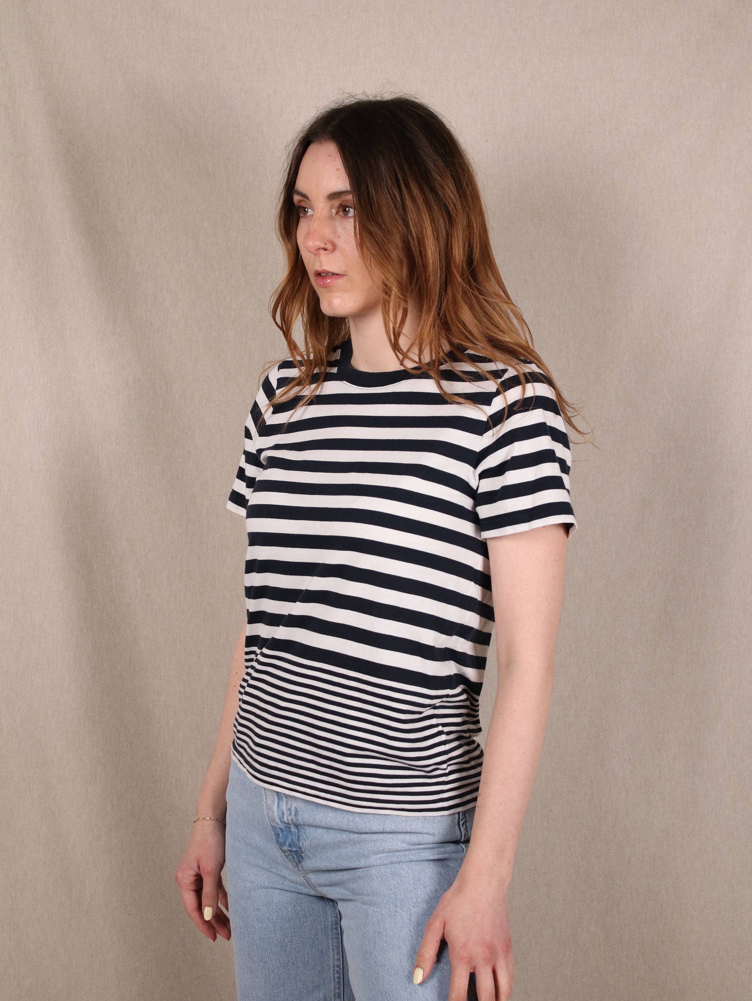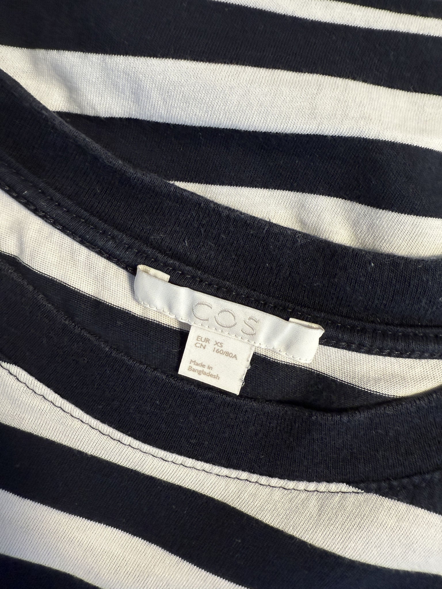 Dieses Secondhand T-Shirt von COS ist ein echtes Streifenwunder! Der klassische Marine-Look trifft auf moderne Coolness - und das in 100 % weicher Baumwolle. Ob casual mit Jeans oder schick unter einem Blazer - dieses Shirt bringt dich mit seinen Streifen immer in die richtige Spur!