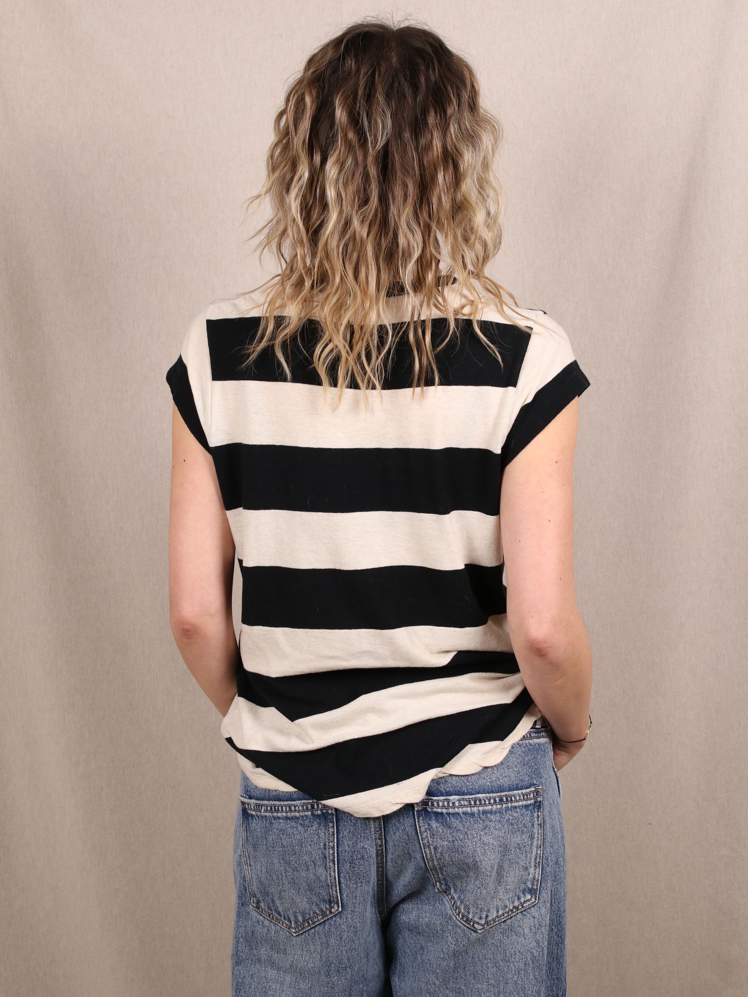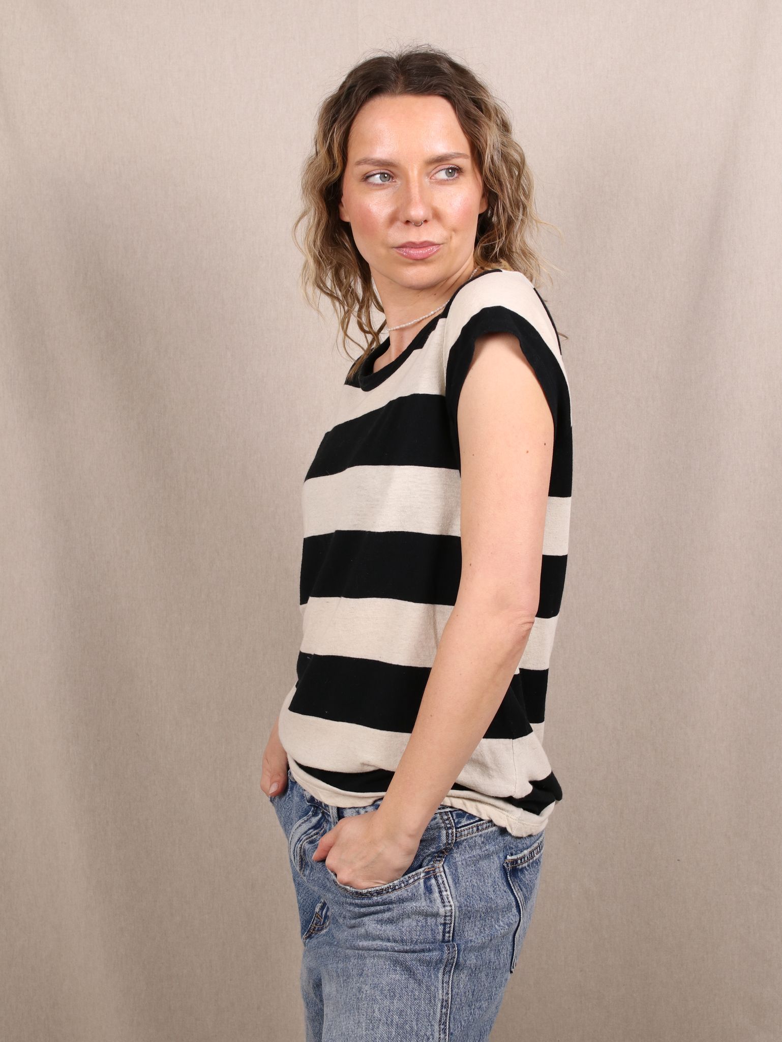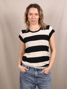 Dieses Secondhand T-Shirt von James Perse steht für entspannten Minimalismus. Die breiten Schwarz-Weiß-Streifen und der cleane Schnitt wirken mühelos cool, ohne laut zu sein. Weiche Baumwolle, perfekter Fall – ein Everyday-Piece mit subtiler Premium-Attitüde.