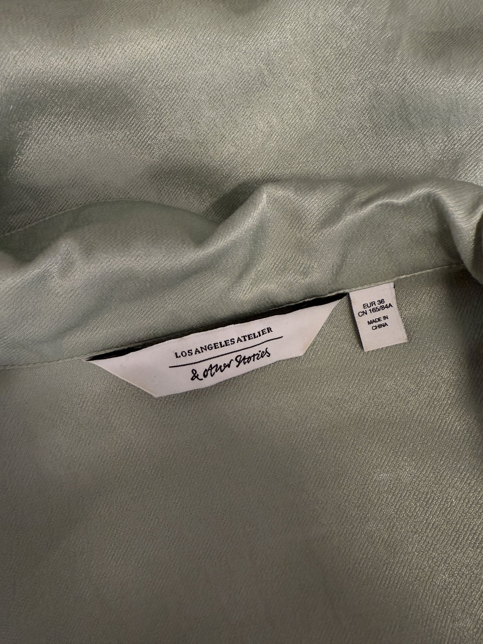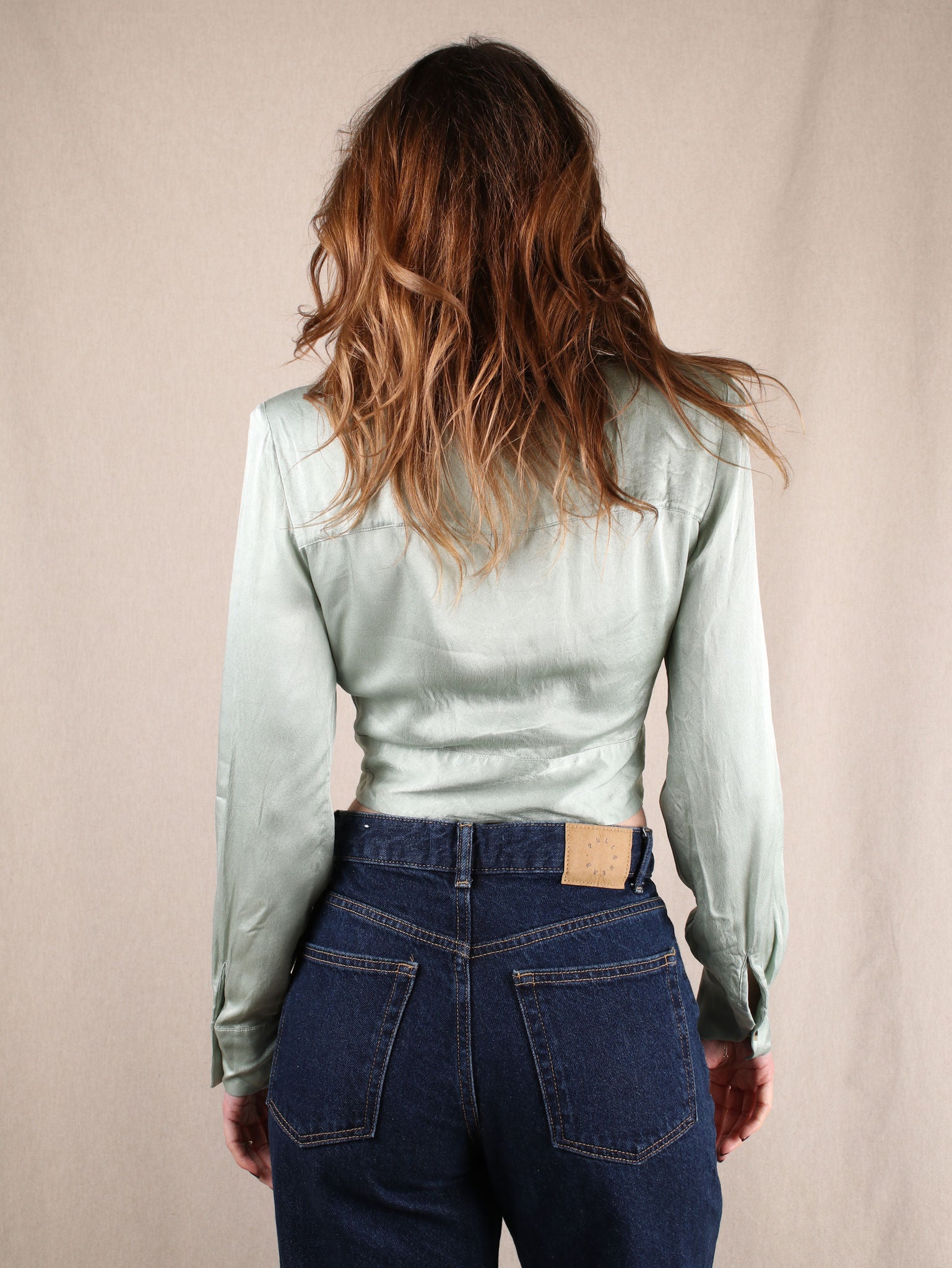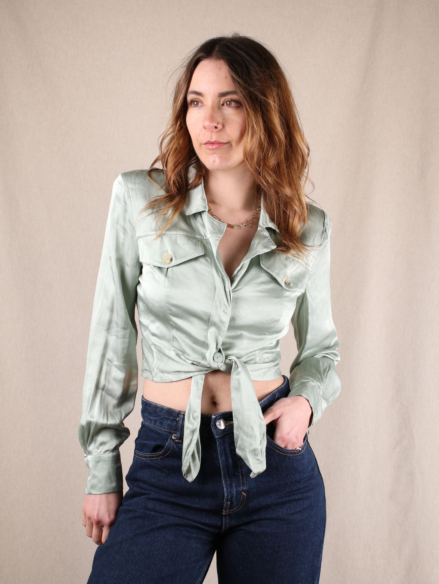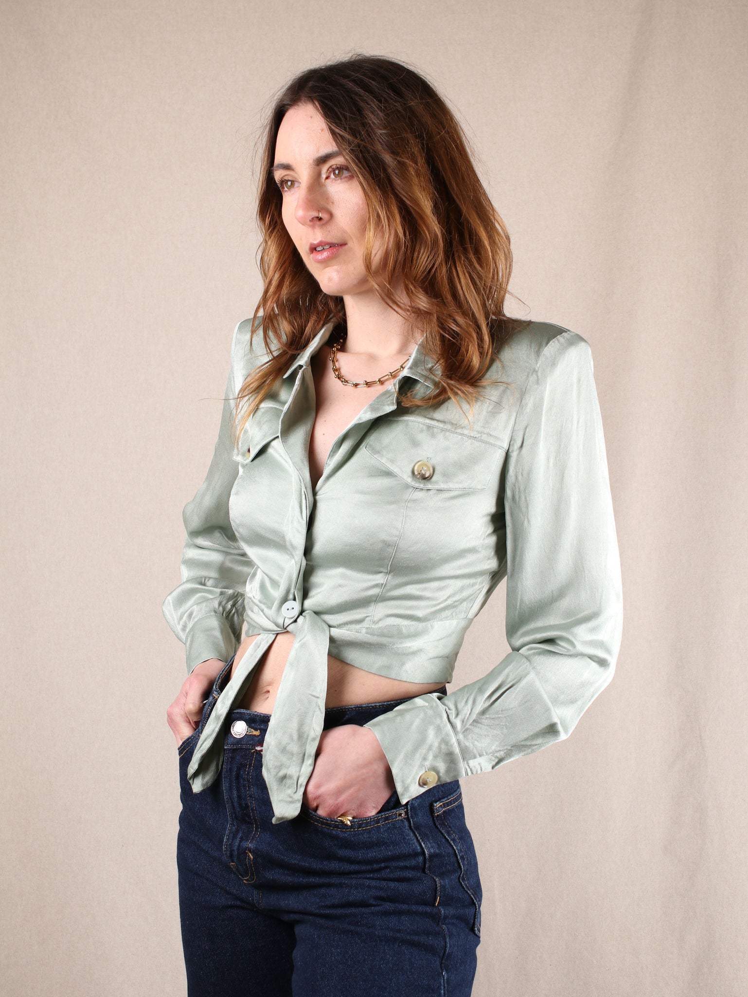 Pre-loved Cropped-Bluse aus Satin in Mintgrün mit Schulterpolstern und Knoten-Detail.