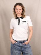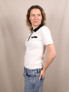 Dieses Secondhand Polo-Shirt von Zara bringt College-Vibes in cleanster Form. Der kontrastierende Kragen und die Knopfleiste setzen grafische Akzente, während der figurbetonte Schnitt für eine klare Silhouette sorgt. Sportlich, schlicht und mit genau der richtigen Portion Vintage-Preppy-Charme.
